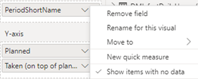 Create a normal stacked column chart. In this case it’s a Stacked Column Chart with current year planned holiday hours stacked with taken holiday hours on top of the planned hours by month. Make sure, the option ‘show items with no data’ is on, to always show every item on the X axis.